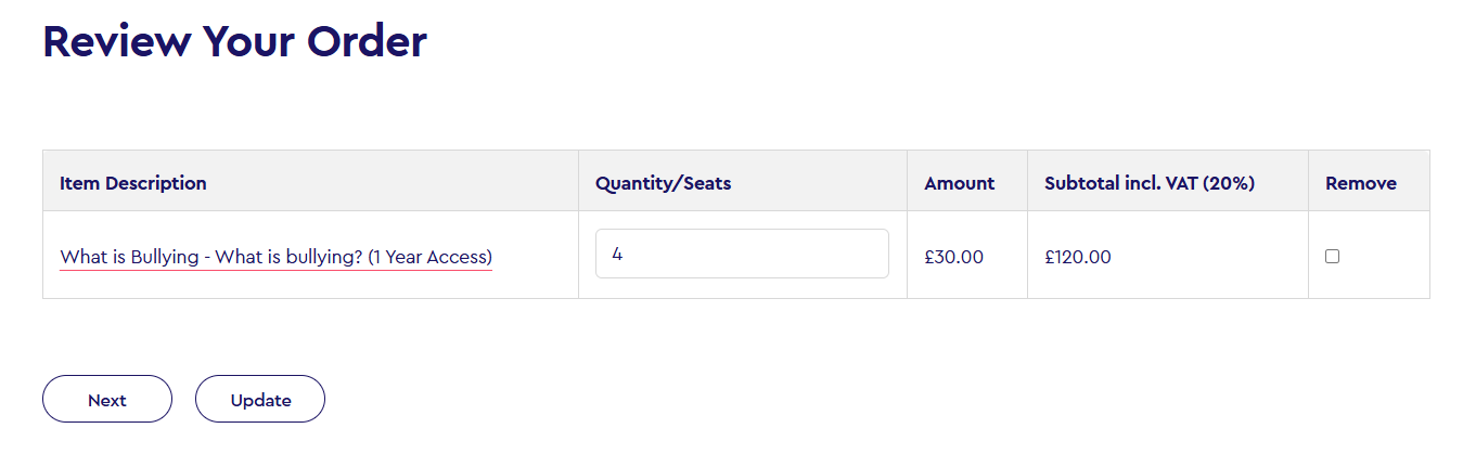 On the ‘Review Your Order’ page, click ‘Next’. If you need to remove any items or change the quantity, tick the