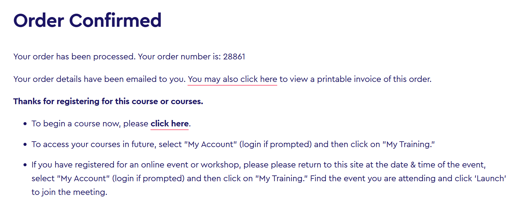 If you have purchased a single quantity of a product, you will see the following confirmation page. Follow the instructions on the confirmation page to access your learning content.