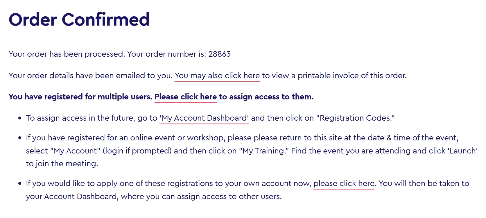 If you have purchased a quantity of two or greater, you will see the following confirmation page. Follow the instructions on the confirmation page to assign access to the learning content.